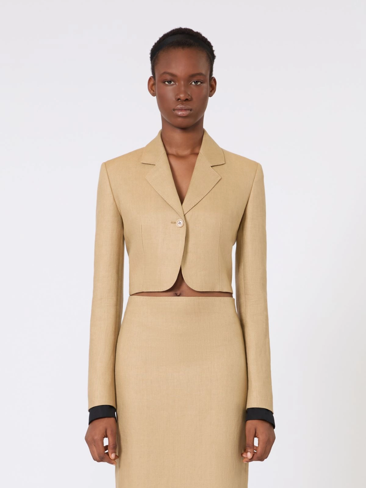 Single-breasted jacket, featuring a fitted silhouette with a cropped waist and stitched pleats on the front.
