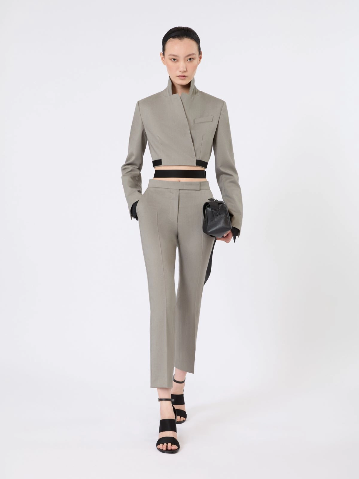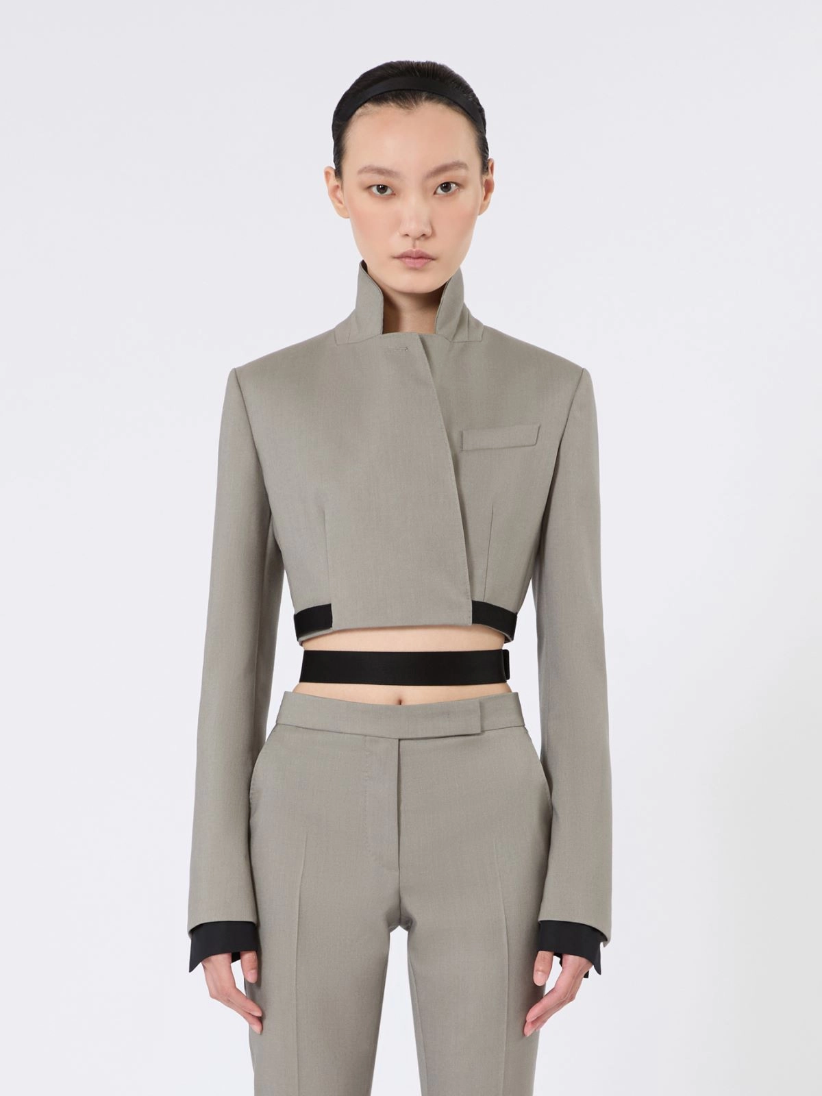 Cropped jacket with a sartorial feel, featuring a lapel collar that crosses over at the waist.