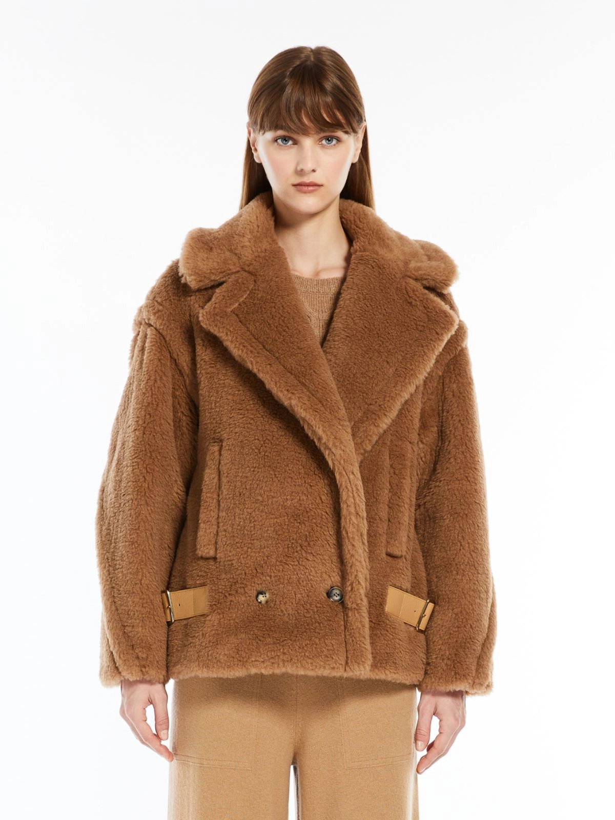 Teddy coat in a double-breasted biker jacket version with leather side straps at the hem.