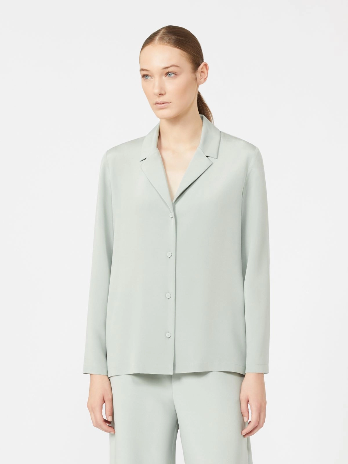 Straight-cut shirt with sleeves that can be adjusted in volume by a metallic ball button and loop.