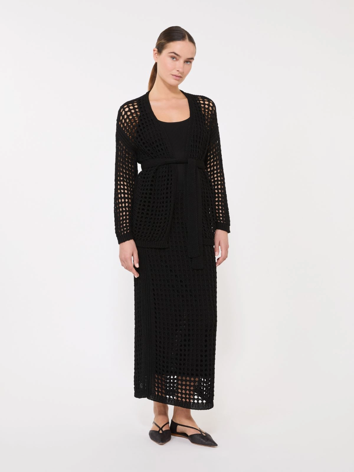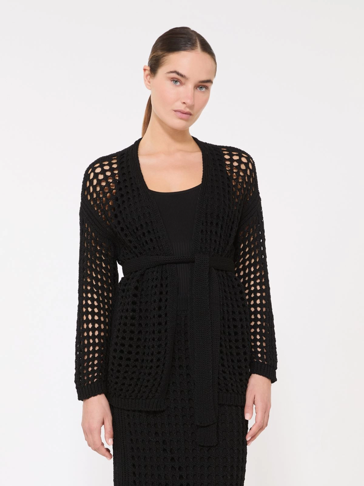 Wrap cardigan, featuring a sheer-effect mesh knit.