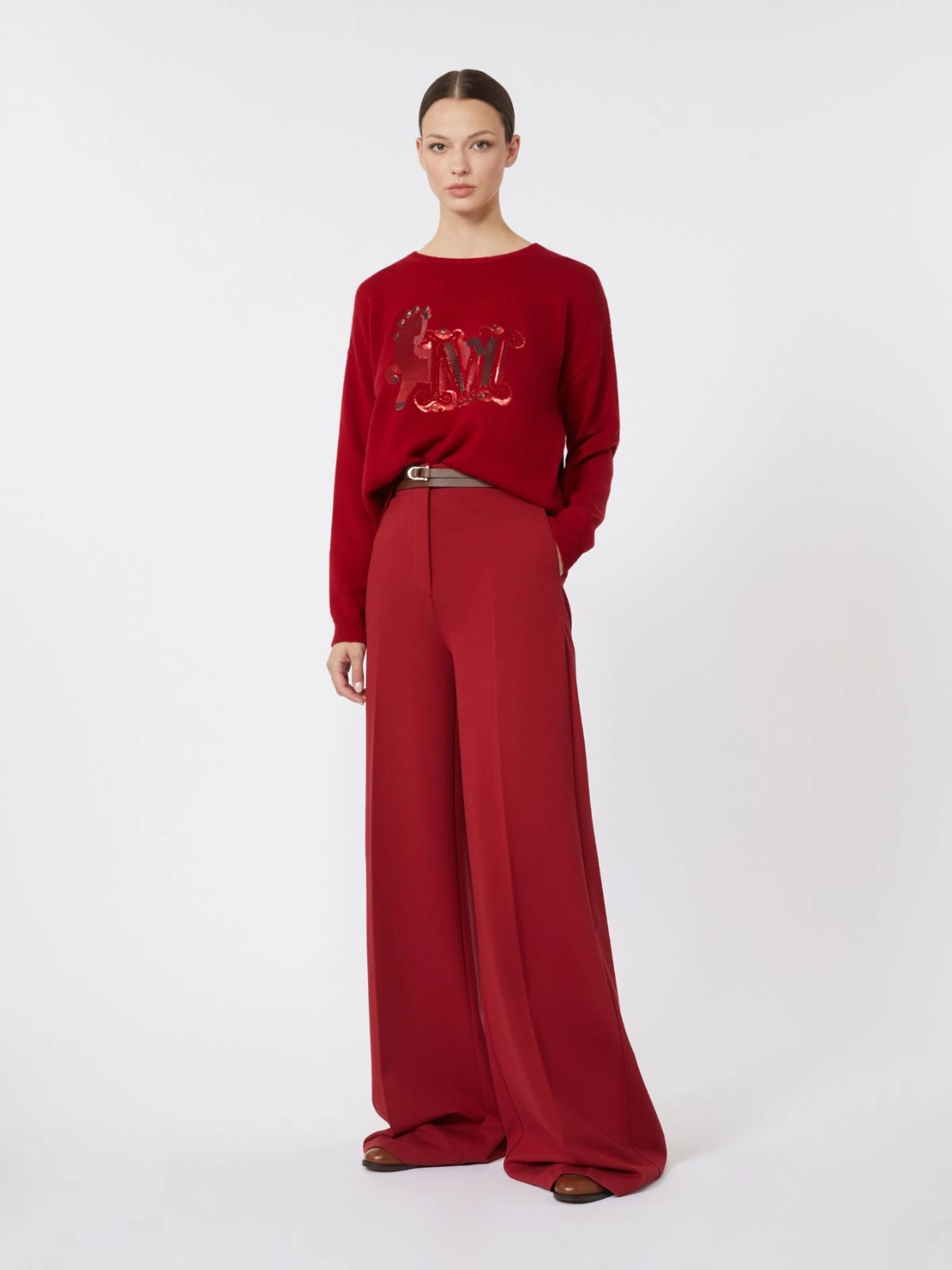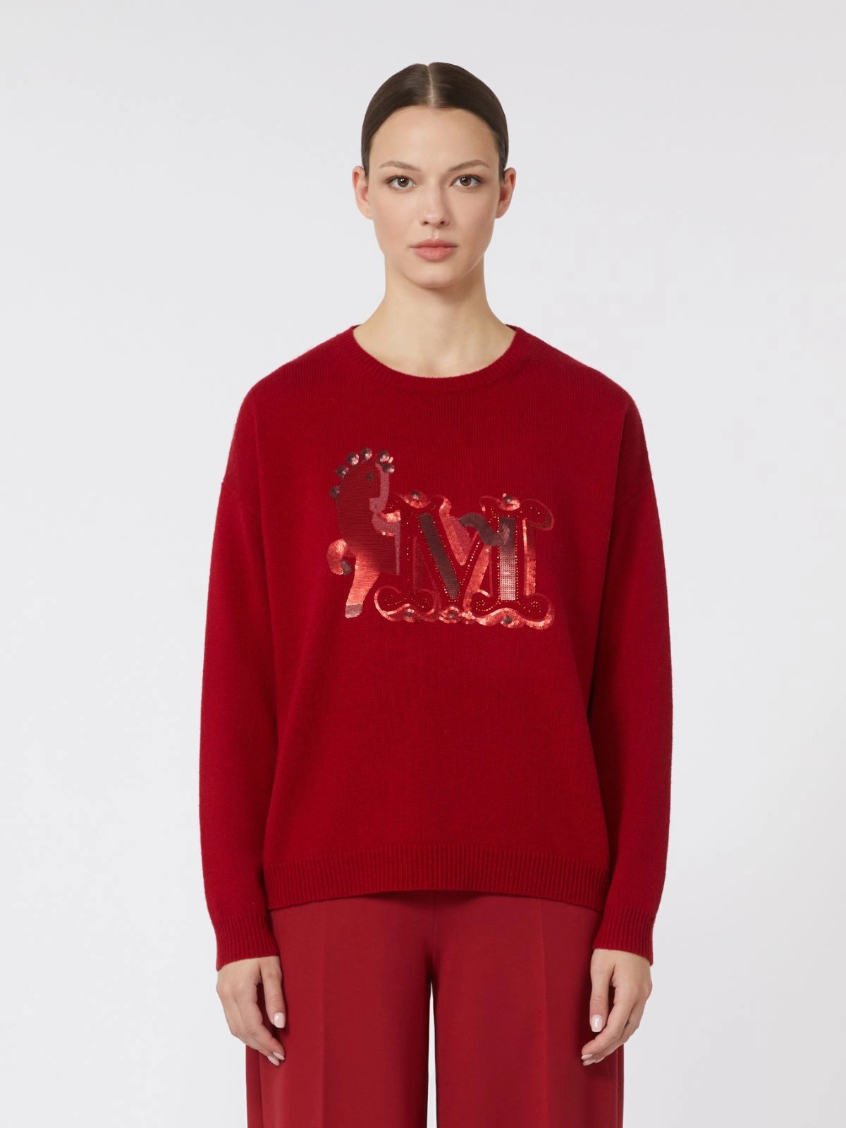 The front of this iconic Max Mara sweater is customised with sequin and rhinestone-embroidered M Monogram detail.