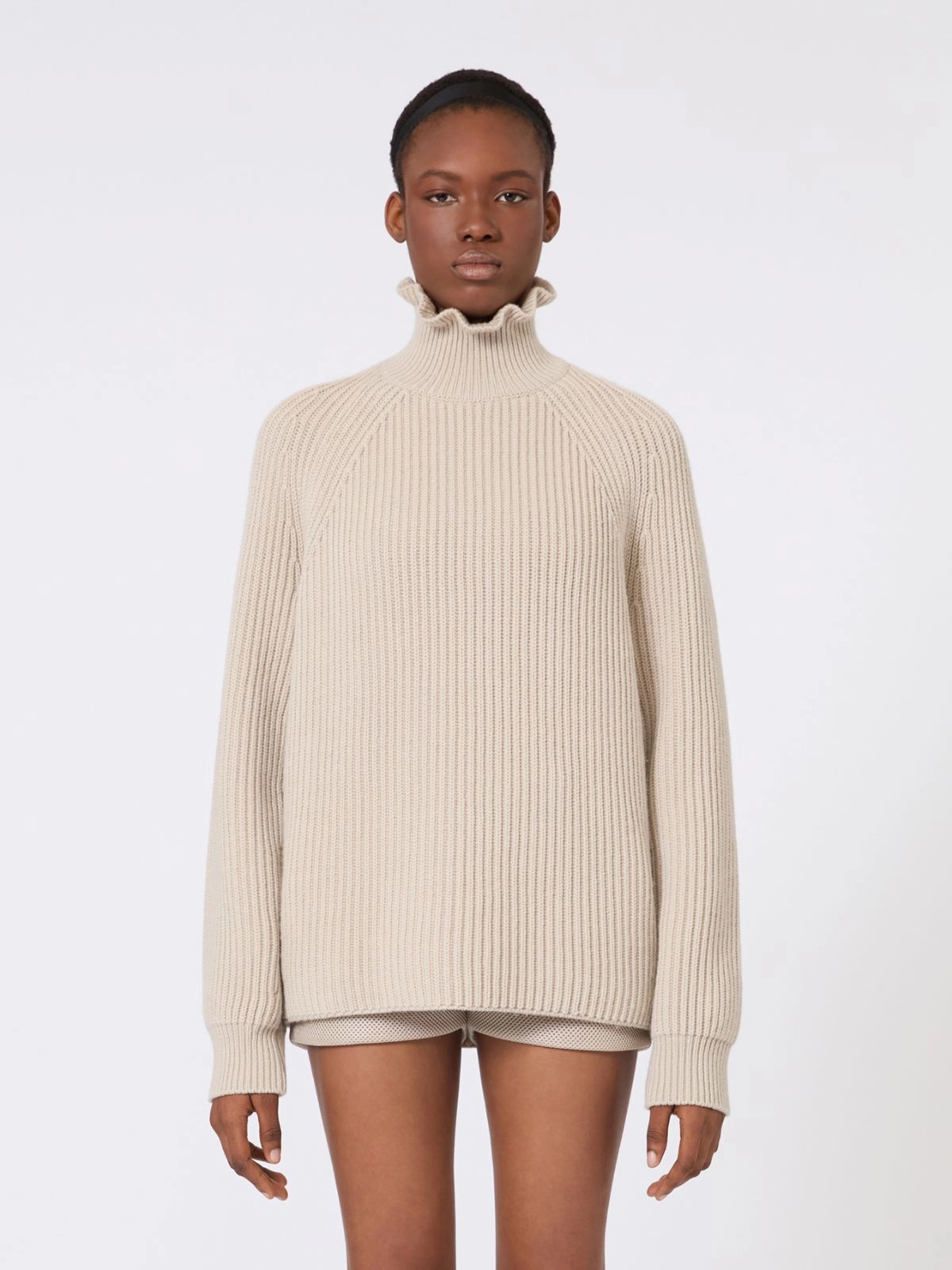 Jumper in an all-over fisherman’s rib knit, featuring a loose high neck that creates a flounce motif.