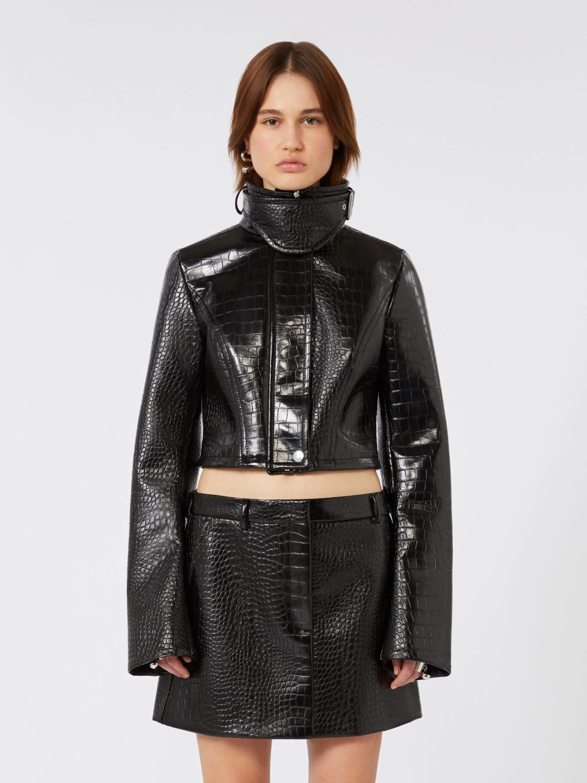 Short, fitted jacket in alligator embossed patent leather, to add a bold touch to your looks. The raised collar with storm flap is a detail borrowed from the trench coat, while the zip fastening and contoured seams take inspiration form biker jacket designs.