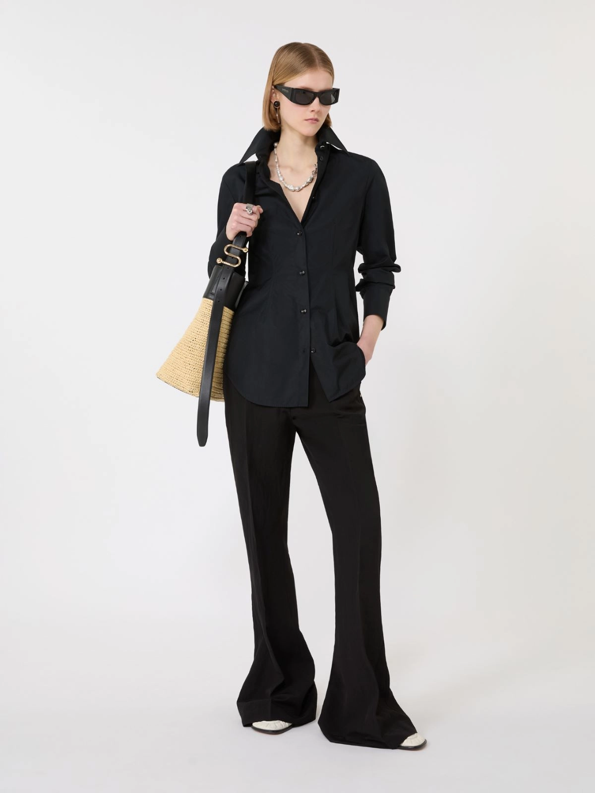 A feminine take on the poplin shirt: a well-defined silhouette, deep dart and side panel-cinched waistline and an ultra-rounded hem to accentuate the hips. Cuffs with two customised metal buttons.