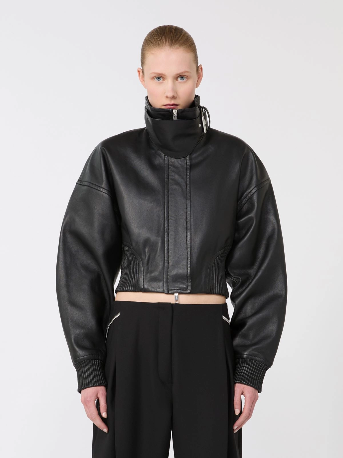Short jacket made of vegetable-tanned leather. The upper part is distinguished by soft volumes, dropped shoulders and bomber jacket sleeves. The silhouette is highlighted by a canneté motif insert on the sides and back yoke.