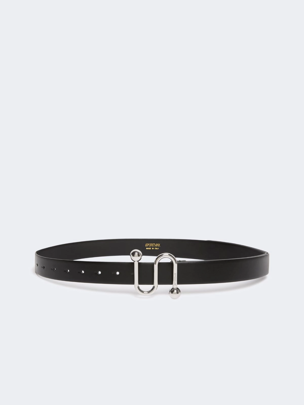 Smooth, lightly padded calfskin belt with seven-hole construction, to be worn at the waist or hips. S-shaped metallic buckle.