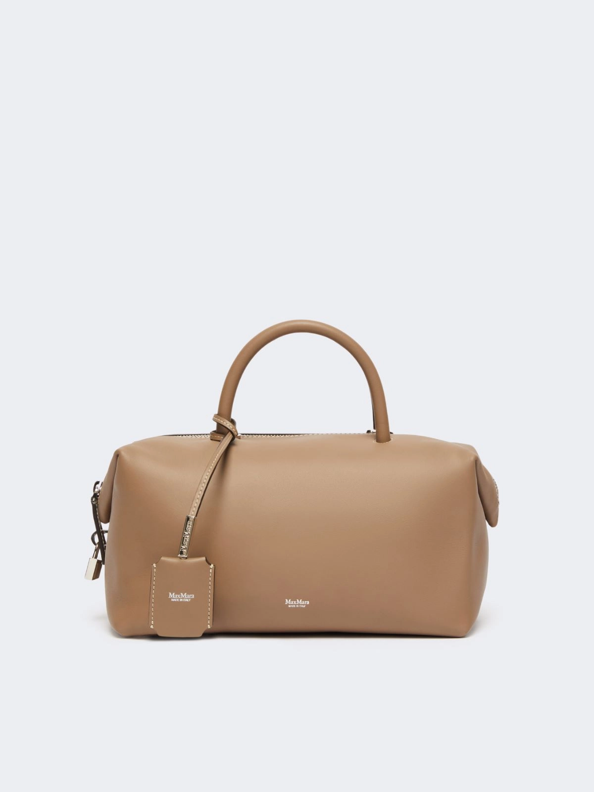 Handbag with two handles and slightly folded sides. Complete with removable shoulder strap for crossbody wear, custom key tag, leather feet and metal Max Mara lettering on the front.