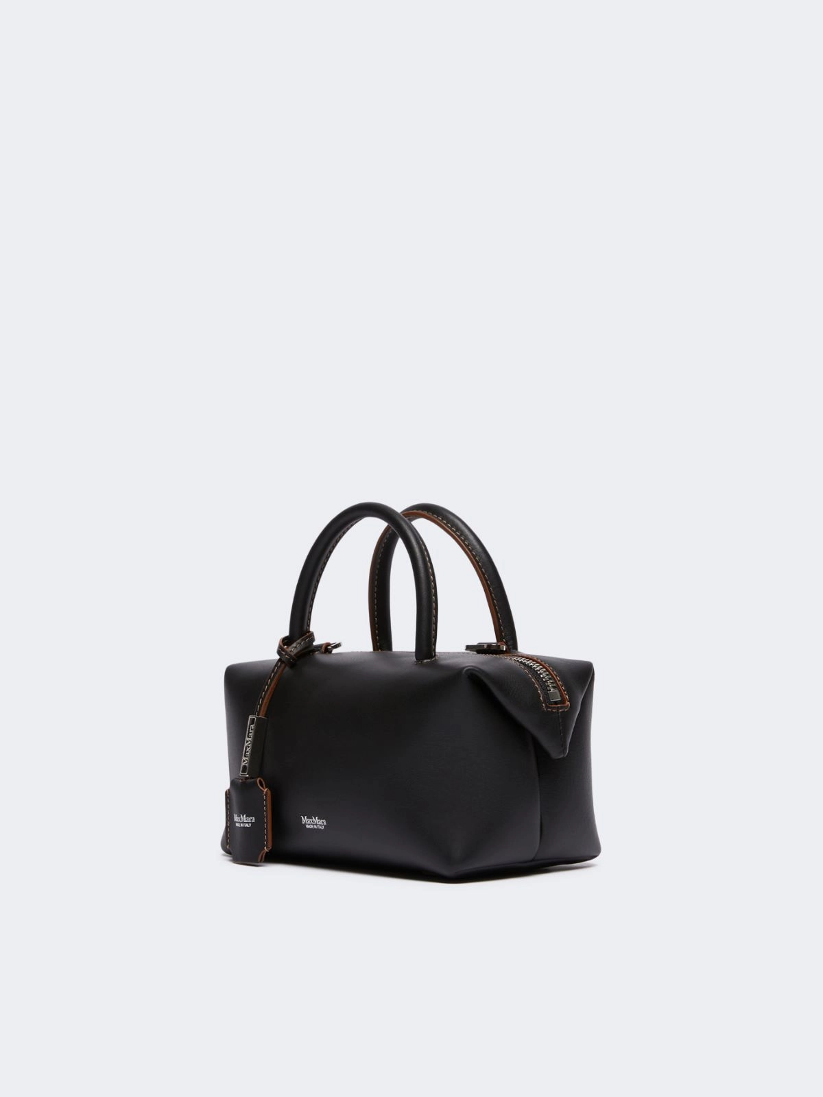 Small structured handbag with double handle and M-shaped folded sides with magnet, padlock and customised key-holder tags.