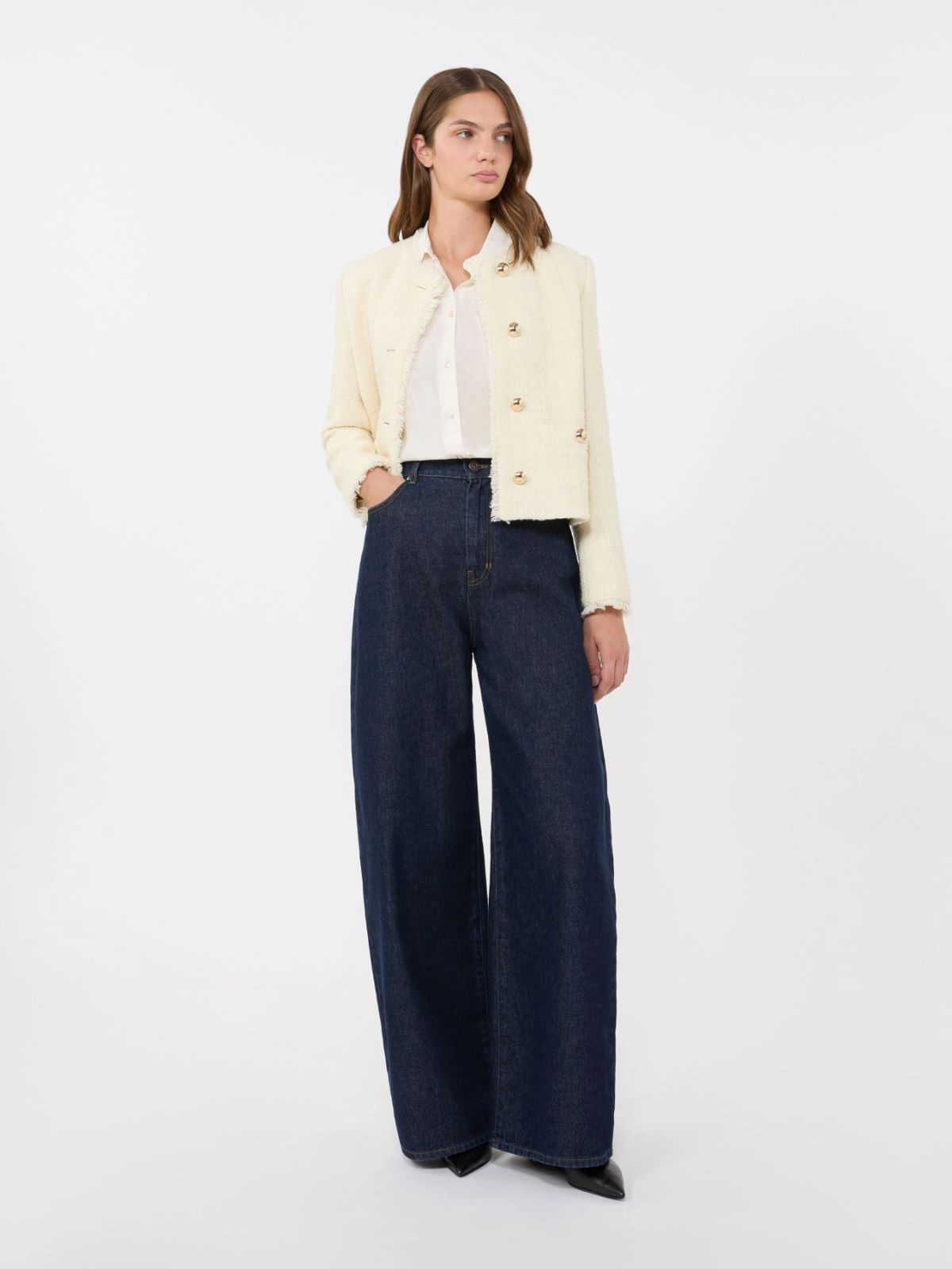 Single-breasted cropped jacket with a distinctive slightly embossed texture and fringed trims.