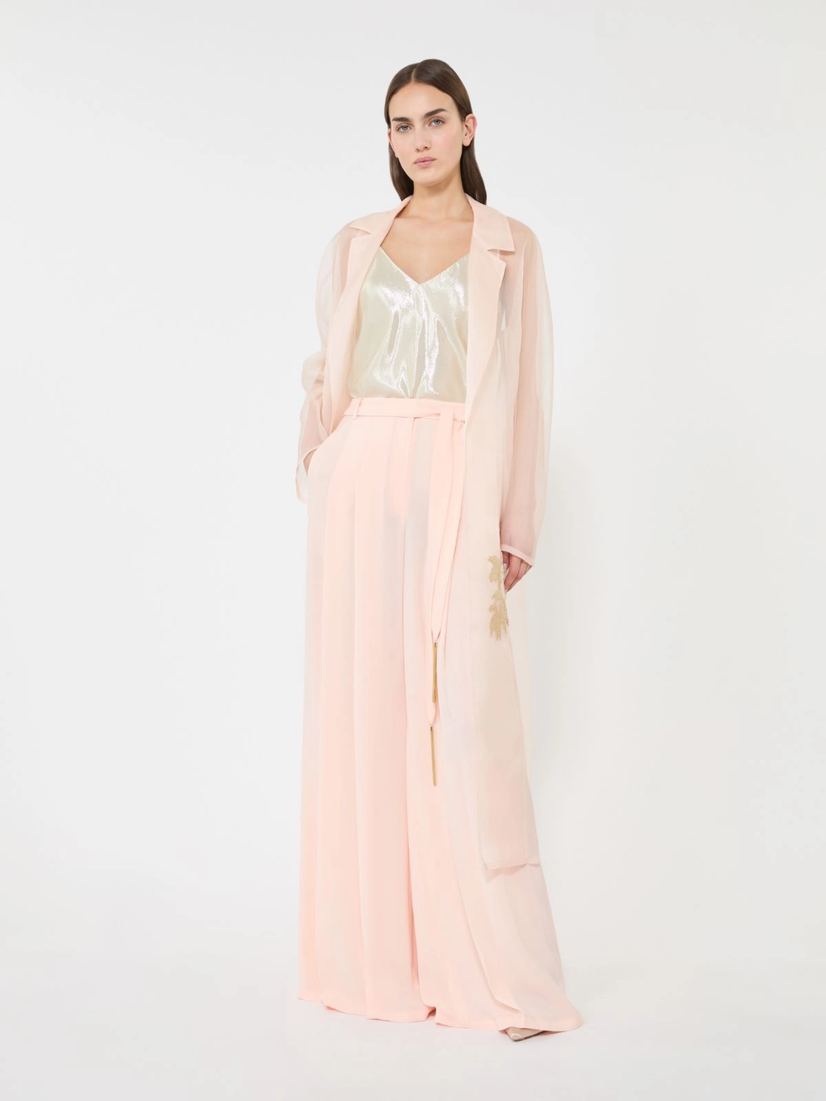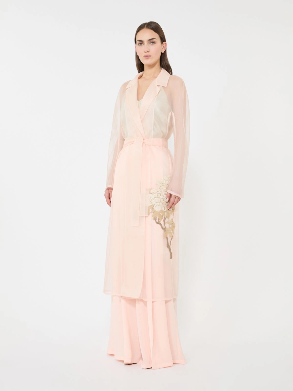 Long robe-style duster coat featuring thread-embroidered 3D ramage detail on the left side.