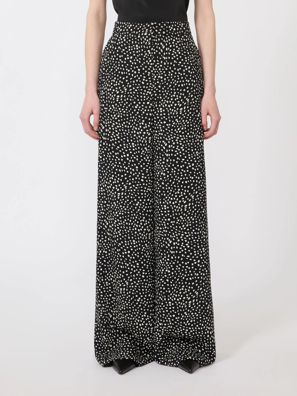Wide-leg trousers with a medium-high waist and an all-over printed collection motif.