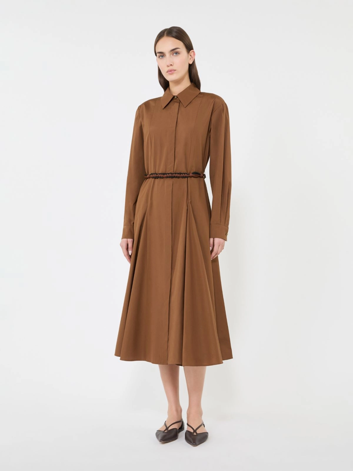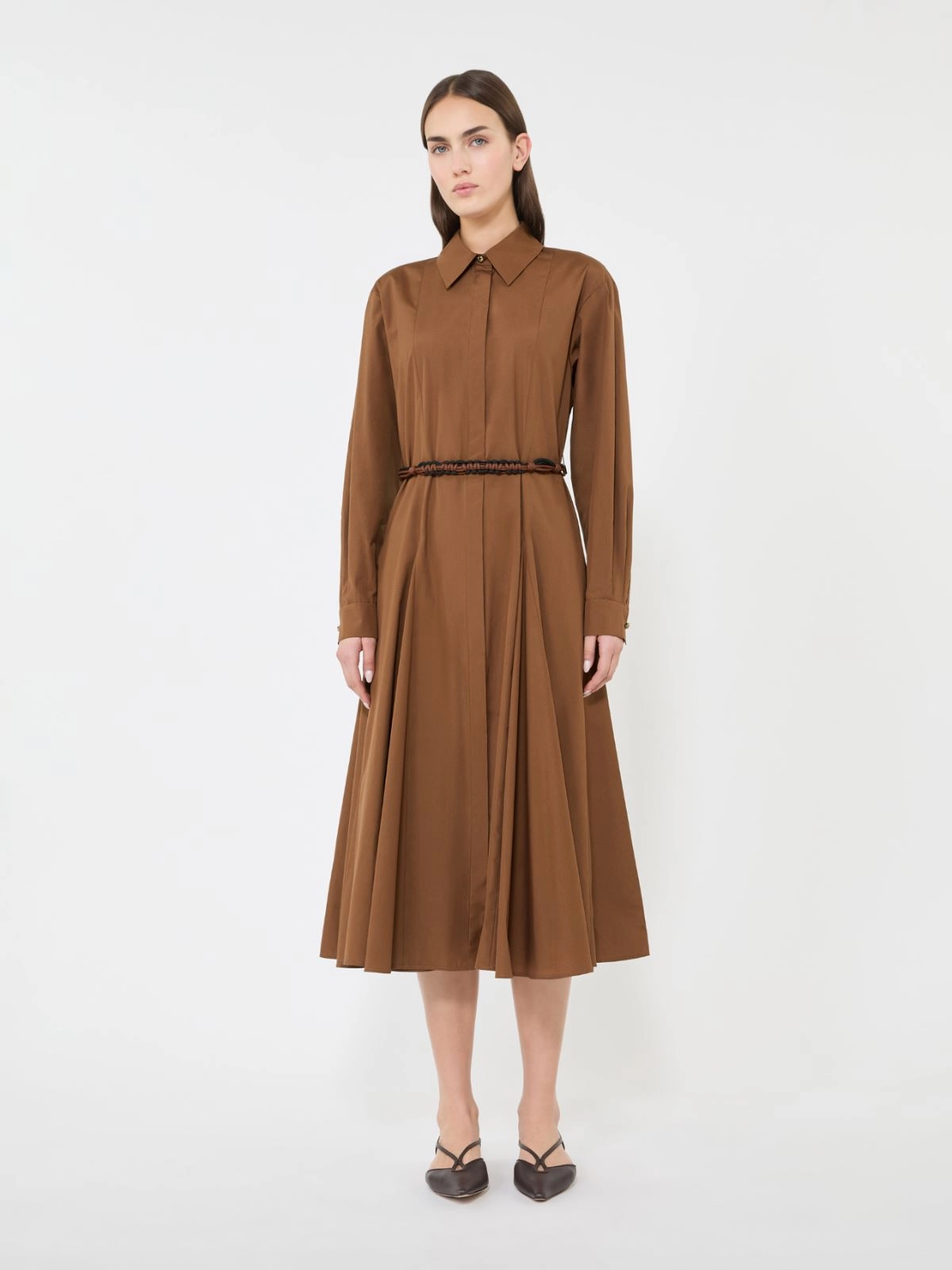 Long shirt dress featuring fisheye dart detail and skirt-inset wedges to add volume and structure to the garment.